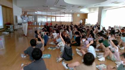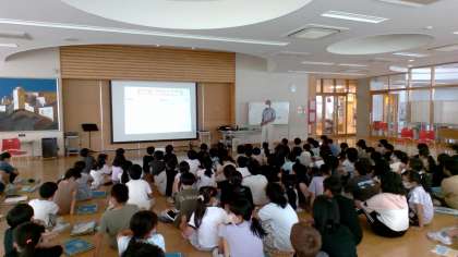4年生は、総合的な学習で環境問題について調べています。今日はその一環で、講師の先生をお招きして、地球温暖化の原因や防止策等について話を聞きました。子供たちは、今日から「エコバックを持っていく」「電気をこまめに消す」などの自分にできることを実行していこうと、意欲を高めていました。