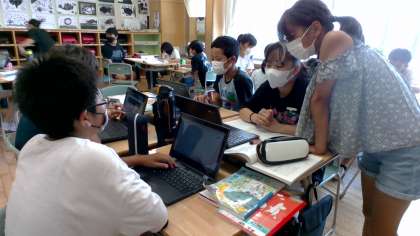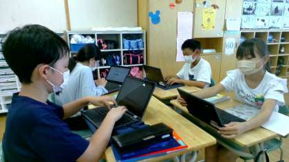 国語科「わたしたちにできること」では、日常の生活にある課題を見付け、提案する内容に合わせて調べ学習をしています。栄養教諭にインタビューをしたり、市役所のホームページを参考にしたり、情報を活用する姿が見られます。
