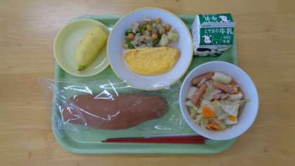 今日の献立は、ココアコッペパン、牛乳、チーズオムレツ、ポトフ、バナナ、ひよこ豆のオリーブオイル炒めです。