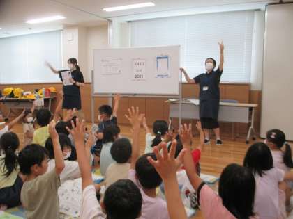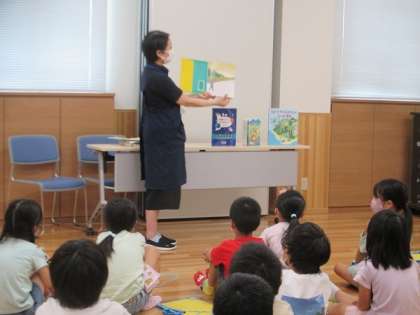 市立図書館豊田分館に行きました。図書館の利用の仕方について話を聞いたり、本の紹介をしてもらったりしました。クイズや読み聞かせで、楽しい時間を過ごしました。