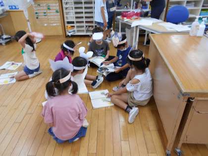 1年生 国語科 公開日 2022/06/24 更新日 2022/06/24 1年生 国語科では、「おおきなかぶ」で音読劇をしようとしています。グループで読み方を工夫したり、流れを確かめたりしていました。