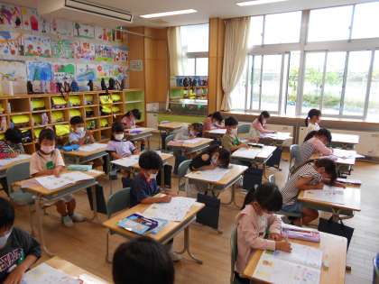 国語科では、「は」「を」「へ」を使って文を作りました。読みながら、どういうときに使うのかを考えて書いていました。