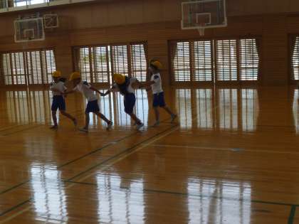 「ジェットコースターは、上ったり、すごいスピードで下りたりするから、ゆっくり歩いたり、速く走ったりしよう。」「飛行機は、上下したり、回ったりするから、体を伸ばしたり縮めたりして回ろう。」など、動きを工夫していました。