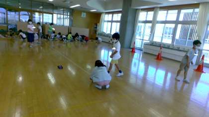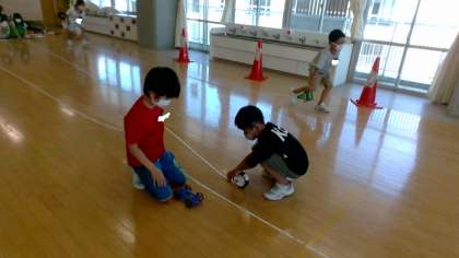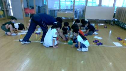 理科「風やゴムで動かそう」の学習では、ゴムで動く車を動かしました。ゴムの伸ばし方によって、車が動く距離が変わることを確かめました。