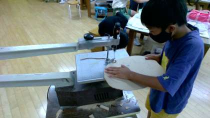 図画工作科「糸のこすいすい」では、ホワイトボードを作っています。飾る場所に合わせて色や形を考え、糸のこで木材を切ったり、水彩で色を塗ったりました。