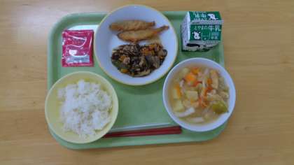 今日の献立は、ご飯、牛乳、わかさぎのフリッター、もずくのチャプチェ、具だくさん汁、しそかつおふりかけです。