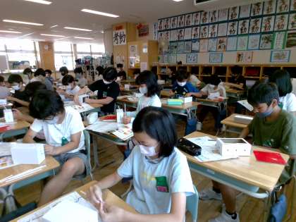 図画工作科では、「くるくるクランク」という題材を扱っています。ストローを出す位置や、本数を吟味しながら作品の基礎を作り上げている子供たちです。