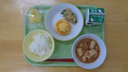 今日の献立は、ご飯、牛乳、麻婆豆腐、かにたま、ナムル、冷凍リンゴです。