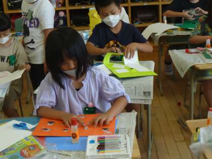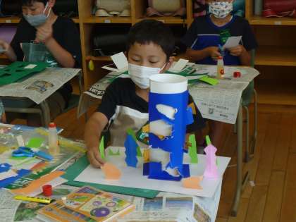 子供たちは、「ハートの窓を作ったよ。窓からいろいろな人が見えるようにしよう。」「水槽の形の窓にしたよ。窓から魚が泳いで見えるようにしよう。」など、自分のイメージに合った窓になるよう、いろいろな窓の形を考えながら作っていました。
