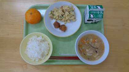 今日の献立は、ご飯、牛乳、冬瓜のそぼろあん、ホタテの照り焼き、ベーコンとゴーヤの卵炒め、冷凍ミカンです。