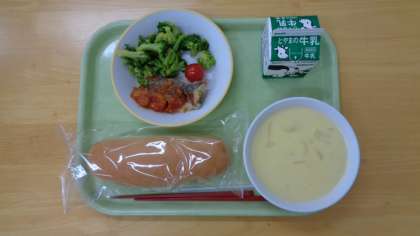 今日の献立は、コッペパン、牛乳、魚のチリソースがけ、ゆでブロッコリー、コーンポタージュ、ミニトマトです。
