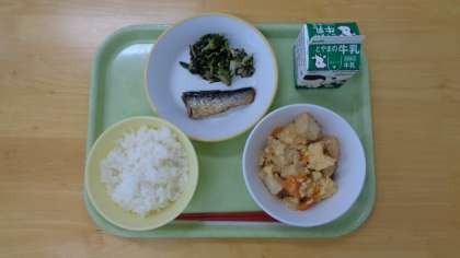 今日の献立は、ご飯、牛乳、鰯のマーマレード煮、磯和え、厚揚げの錦とじです。