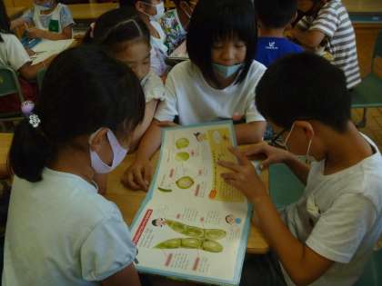 「夏休みはもっと暑くなるから、水やりは増やしたほうがいいね。」「もうそろそろ追肥して、夏休みも元気な野菜にしよう。」など、同じ野菜作りの友達と話をしながら、夏休みの世話について見通しをもちました。