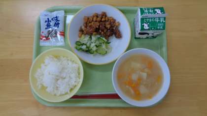 今日の献立は、ご飯、牛乳、豚肉と大豆の甘からめ、添え野菜、五目味噌汁、味付け小魚です。