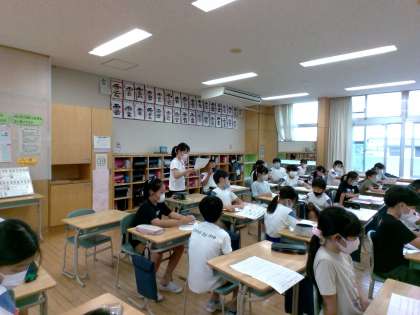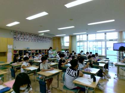 夏休みに調べてきた、地域に伝わる民謡について分かったことや気付いたことを発表し合いました。子供たちは、「おわら風の盆は、教科書で聞いたこきりこ節と楽器や曲調が全然違っていた」「リズムがゆっくりで、踊りも様々だった」などと話していました。