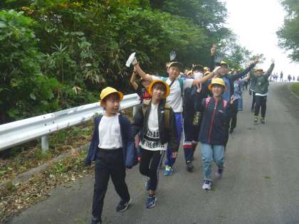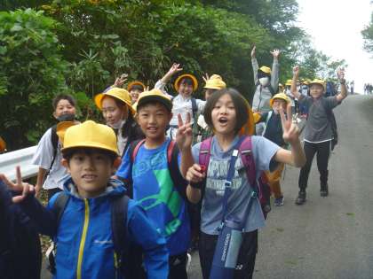 写真は登山を開始した直後の様子です。子供たちは、元気いっぱいでした。