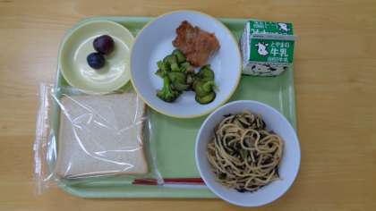 今日の献立は、食パン(減)、牛乳、照り焼きチキン、ビーンズサラダ、ベーコンとひじきの和風スパゲッティ、巨峰です。