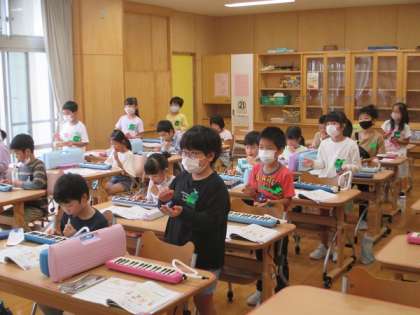 「山のポルカ」を鍵盤ハーモニカ1と2,カスタネット、タンブリンのパートに分かれて合奏しました。2拍子にのって演奏しながら、リズムを重ねる楽しさを味わいました。