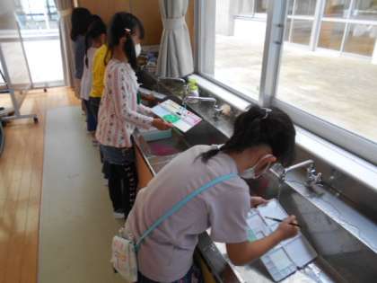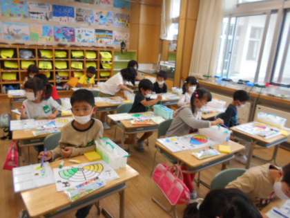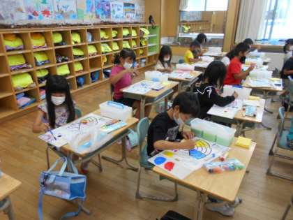 子供たちは、真新しい絵の具セットを大事そうに開き、筆で水と絵の具を混ぜて、嬉しそうに色を塗っていました。