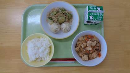 今日の献立は、ご飯、牛乳、エビ包子、バンサンスー、麻婆豆腐です。