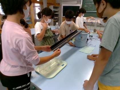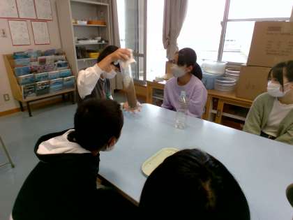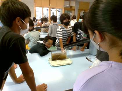 水の中に土を流し込み、層ができるか調べました。流れる水のはたらきによって、どのように地層ができるかを観察しました。