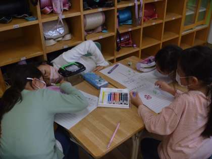 捕まえた後、生き物の観察をしました。子供たちは、生き物の世話の仕方を調べ、発見カードにまとめました。