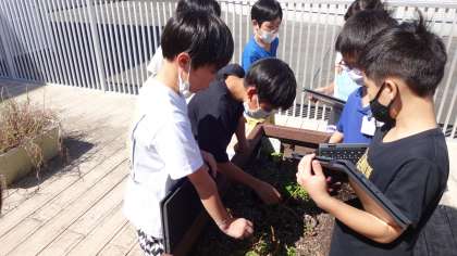 3年生 総合的な学習の時間 公開日 2022/10/04 更新日 2022/10/04 3年生 総合の学習では、大豆について調べています。プランターで育てている大豆が熟してきました。さやや中の種の様子をじっくり観察しました。