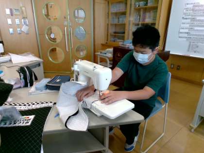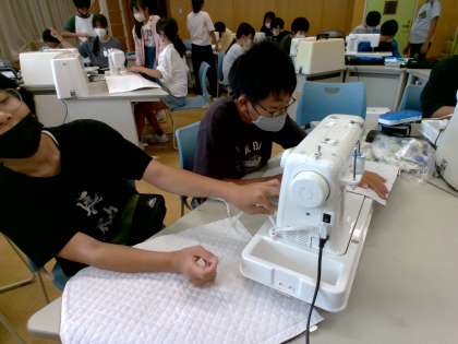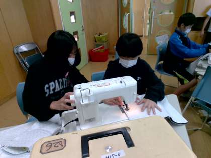 家庭科では、ナップザックをつくっています。今日は、ミシン縫いをしました。慣れないミシンに悪戦苦闘しながらも協力して完成に向けて活動していました。