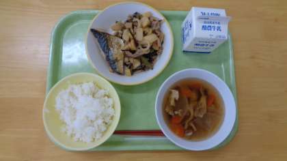 今日の献立は、ご飯、牛乳、鯖の塩焼き、マコモタケの炒め物、きのこ汁です。
