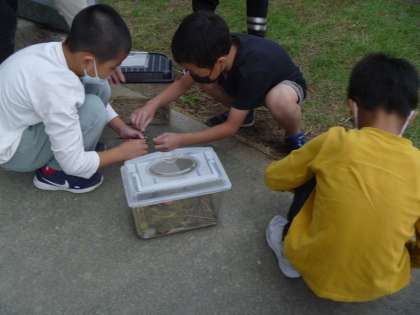学校で捕まえた虫と友達になろうと、えさをやったり、すみかを作ったりしました。