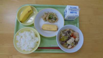 今日の献立は、ご飯、牛乳、厚焼き卵、もやしのおひたし、すき焼き、バナナです。