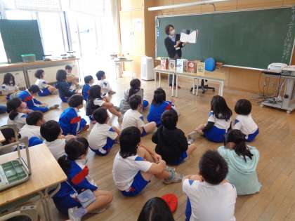 子供たちは、食い入るように見たり聞いたり、時には、笑ったり驚いたりと様々な姿が見られました。その後は、「図書館に行きたい。」「今度の土曜日行こう。」などの声が聞こえてきました。