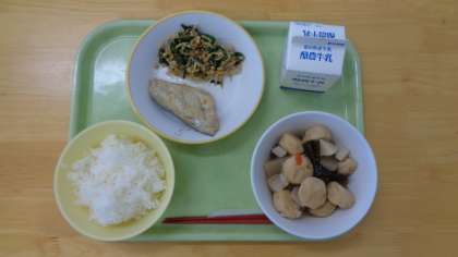 今日の献立は、ご飯、牛乳、鰆の幽庵焼き、炒り大豆和え、おでんです。