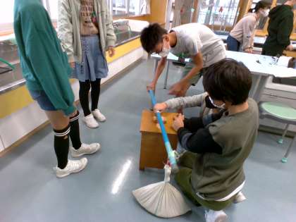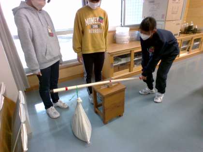 「支点」「力点」「作用点」という言葉を知った子供たち。できるだけ小さい力で重いものを持ち上げるためにはどのようにしたらいいのかを実験を通して調べました。