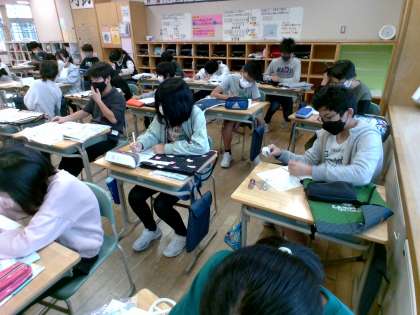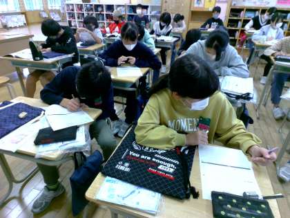 家庭科では、ナップザック作りに挑戦してきました。ついにクラスのみんなが作り終え、今日は互いのナップザックを見合いました。自分の作品の出来を、改めて振り返る子供たちでした。
