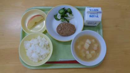 今日の献立は、ご飯、牛乳、和風煮込みハンバーグ、きざみ和え、豆腐の味噌汁、りんごです。
