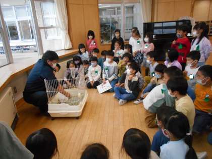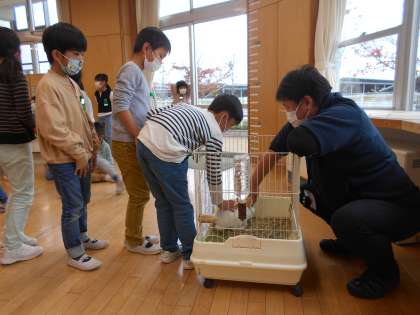 ウサギのミルクのことを安田先生から教えていただきました。みんな真剣な表情で話を聞いていました。最後に、一人ずつミルクを触わる時間をとりました。