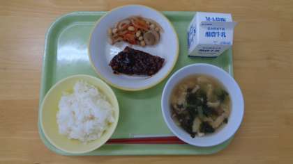 今日の献立は、ご飯、牛乳、魚の甘味噌がけ、五目煮豆、薄くず汁です。