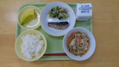 今日の献立は、ご飯、牛乳、鰯の土佐煮、もやしのおひたし、豚肉の南蛮煮、バナナです。