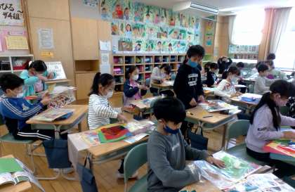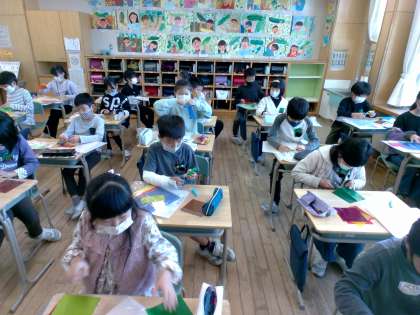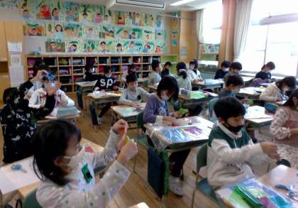 光を通す材料をいろいろな形に切ったり組み合わせたりして、どんなものが表せるかを試しました。子供たちは、実際に光にかざしてみながら、楽しい世界を表そうと頑張っていました。