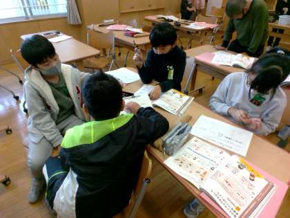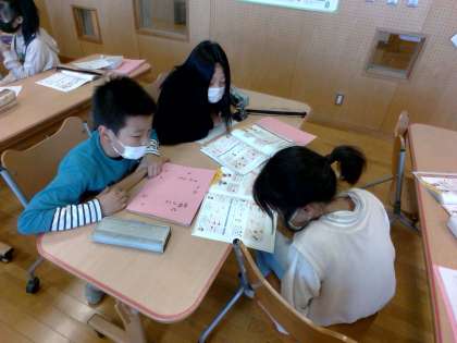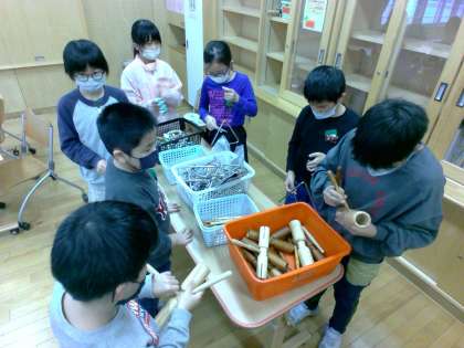 ウッドブロック、カスタネット、トライアングル等の打楽器の特徴をいかして自分たちだけの「音楽づくり」に挑戦しています。今日はいろいろな楽器を試して、「最初は小さくしてだんだん大きくしよう」「ウッドブロックとトライアングルを合わせてみよう」と音の強弱や楽器の組み合わせも考えて楽器を決めていました。