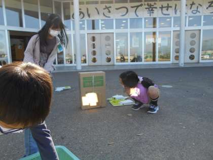 晴天に恵まれ、鏡で跳ね返した日光が当たったところがあたたまるのかを調べました。