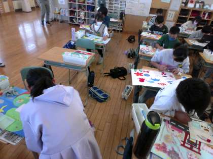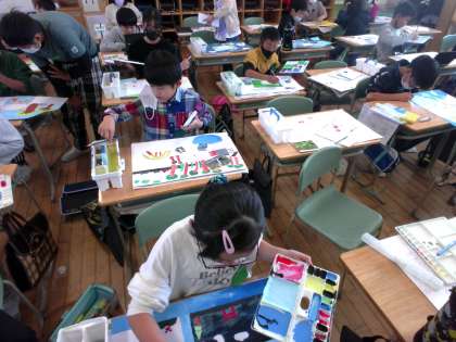 図画工作科「まだ見ぬ世界」では、色を塗り始めています。表したいことに合わせて道具や色、塗り方を変えていました。