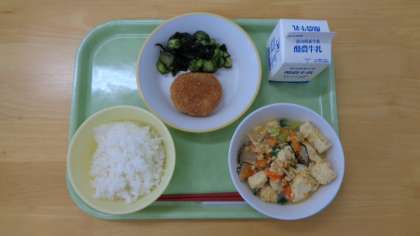 今日の献立は、ご飯、牛乳、里芋コロッケ、酢の物、炒り豆腐です。