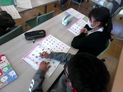 外国語の学習では、単語の発音を聞いて、アクセントのついている箇所に印をつけていました。「もう一度(聞きたい)!!」と言い、真剣に聞く姿が見られました。