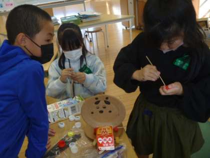「ペットボトルのキャップに竹串を通したんだけど、なかなかできないな」「トイレットペーパーの芯に羽をつけて飛ぶようにしたいんだけど、この羽の付け方でいいかな」など、友達と考えながら作っていました。