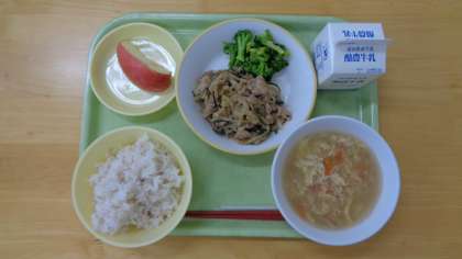 今日の献立は、麦ご飯、牛乳、スタミナレバー丼、ゆでブロッコリー、中華かき玉汁、りんごです。