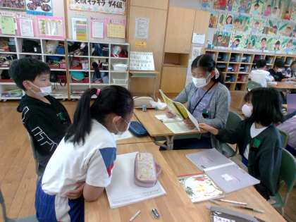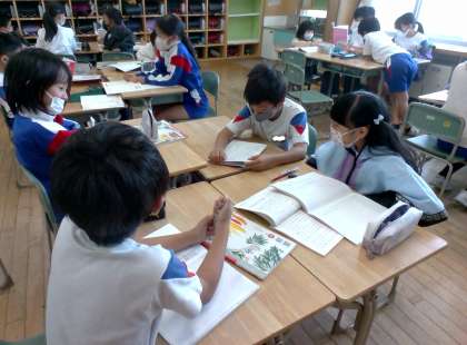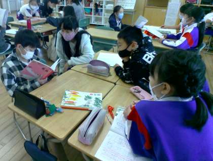 物語の魅力を紹介する文章を読み合い、感想を伝え合いました。子供たちは「マーちんが最後には木の大切さや偉大さに気付き、プラタナスの木を守っていこうとするところが魅力だと思った」「不思議な話だけど、読み終わった後には自分も木を大切にしたいと思えた」など、いろいろな意見を伝え合っていました。