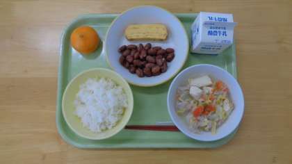今日の献立は、ご飯、牛乳、厚焼き卵、煮豆、塩こうじ鍋、みかんです。