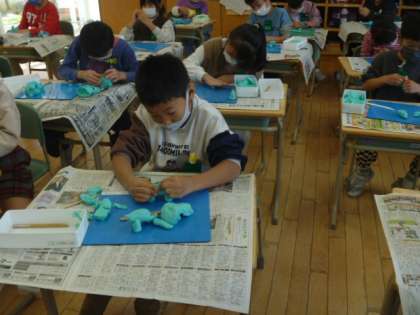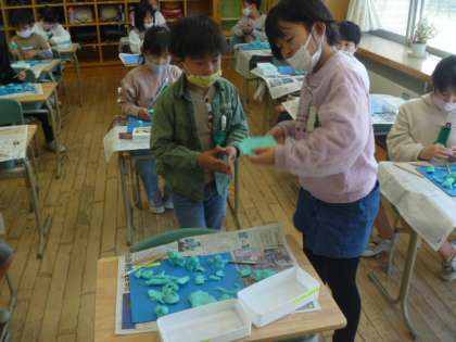子供たちは、「家族で海に行ったことを思い出して作ったよ。」「温泉に行って親戚と遊んだことを思い出して作ったよ。」など、楽しかったことを思い出しながら作りました。
